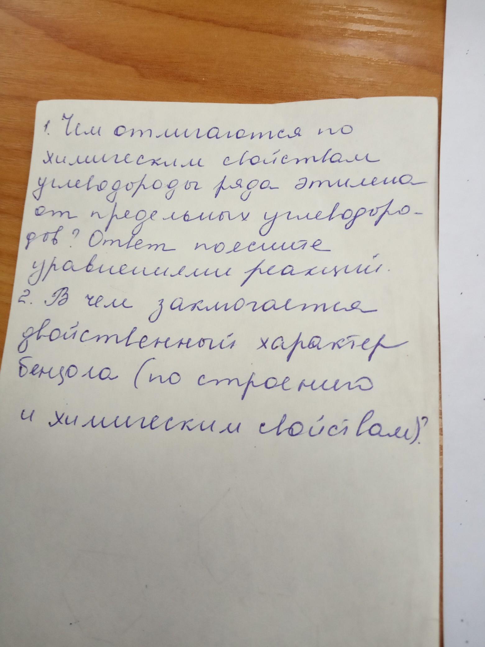 2. Бензол по составу относится к ненасыщенным углеводородам (гомологический ряд CnH2n−6), но в отличие от углеводородов ряда этилена, C2H4, проявляет свойства, присущие ненасыщенным углеводородам (для них характерны реакции присоединения), только при жёстких условиях, а вот к реакциям замещения бензол более склонен. Такое «поведение» бензола объясняется его особым строением: нахождением атомов в одной плоскости и наличием в структуре сопряжённого 6π-электронного облака.