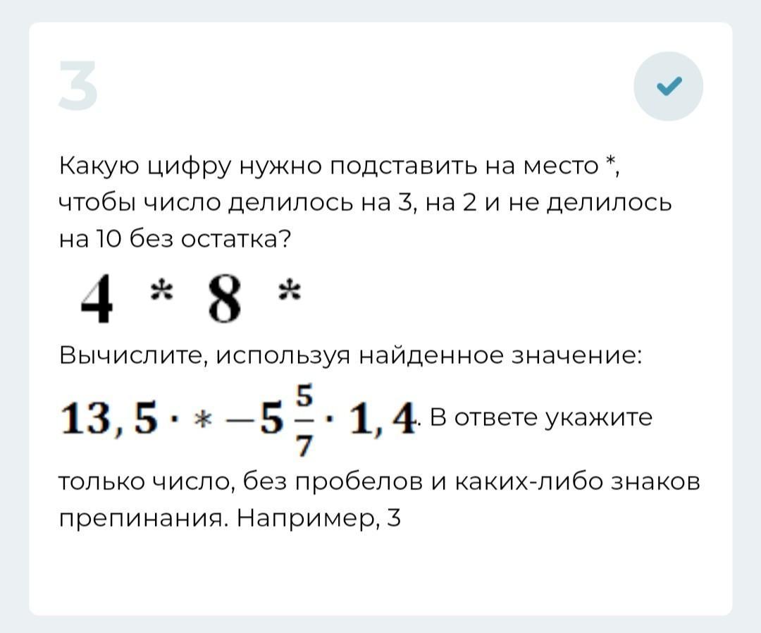 Пошаговое объяснение: 4+8 кратно 3, тогда * = 3 или 6, но она чётная, поэтому это 6. Первое действие равно 81, второе равно 8, итог 81-8 = 73.