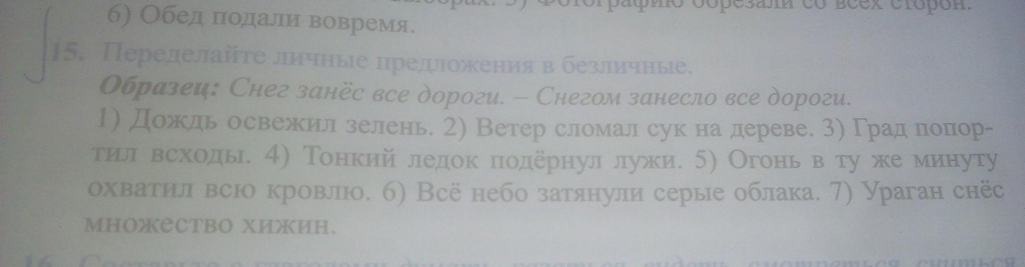 1 Дождем освежило зелень. 2 Ветром сломало сук на дереве.3 Градом попортило всходы. 4 тонким ледком подернуло лужи. 5 Огнем в ту же минуту охватило всю кровлю. 6 Все небо затянулось серыми облаками. 7 ураганом снесло множество хижин.