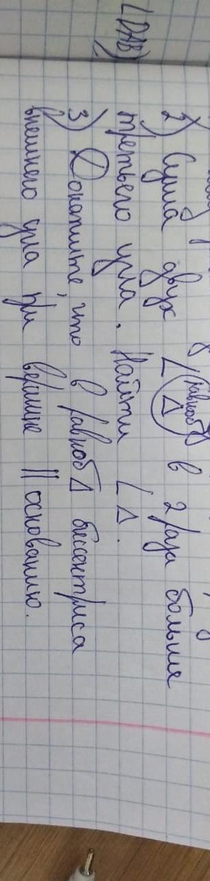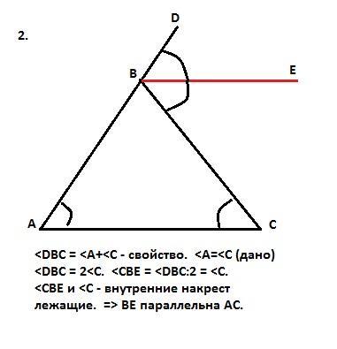 2. Внешний угол треугольника равен сумме двух внутренних, не смежных с ним. Треугольник дан равнобедренный, а внешний угол - при вершине. Этот угол равен сумме двух углов при основании, а половина этого угла (между биссектрисой и боковой стороной) равна углу при основании. Эти равные углы - внутренние накрест лежащие при биссектрисе внешнего угла и основании и секущей - боковой стороне. Следовательно, биссектриса параллельна основанию, что и требовалось доказать.