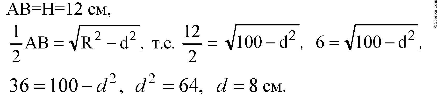 Высота цилиндра равна 12, а радиус основания равен 10. Цилиндр пересечено плоскостью, параллельно его оси так, что в сечении образовался квадрат. Найти расстояние от оси цилиндра до секущей плоскости.