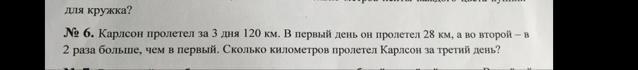 Карлсон пролетел за три дня 120 км первый день пролетел 28 км а во второй в два раза больше чем первый сколько километров пролетел Карлосон За три дня