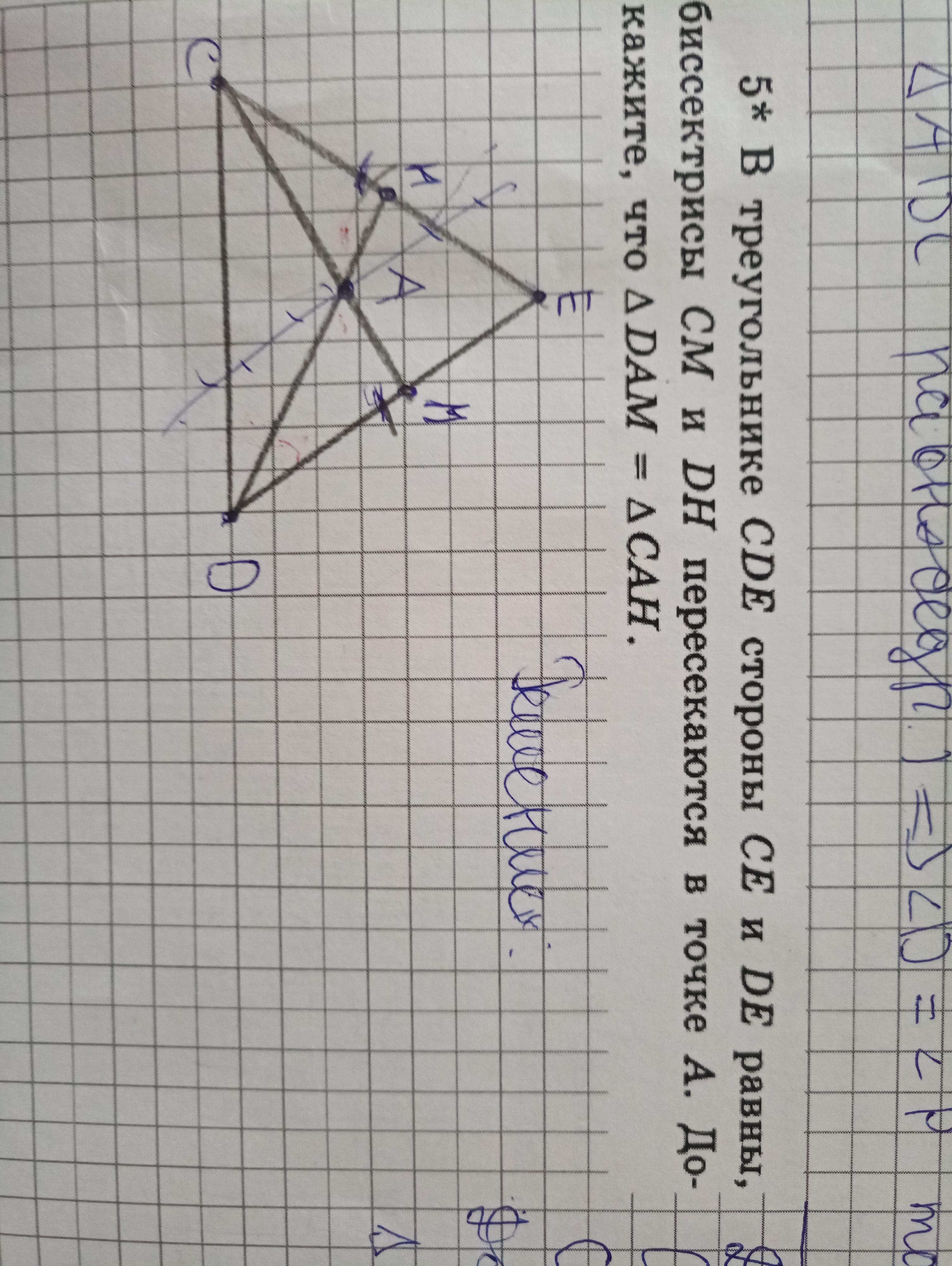 они равны по стороне и прилежащим к ней углам(угол АСН=углу ADM тк 1/2 углов при основании,угол НАС=МAD тк вертикальные ,а СА=AD)