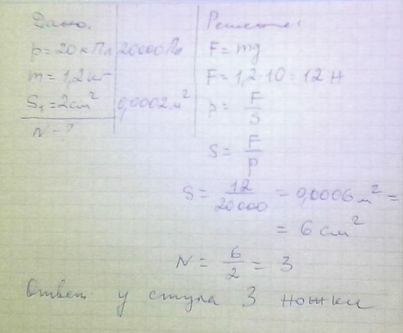 Сколько ножек у стула,если известно,что он оказывать давление на пол 20 КПа?