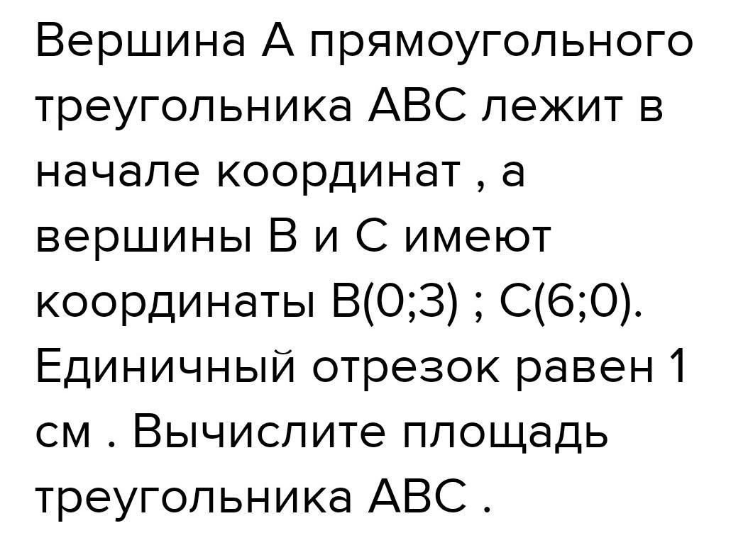 Пошаговое объяснение:1. AB=3см, BC=6см.2. угол A=90°3. S=1/2AB*BC.