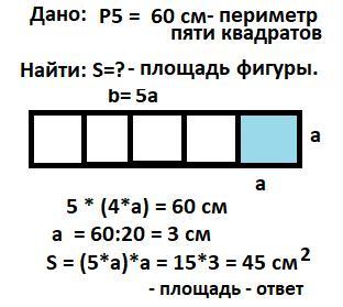 Прямоугольник разделили на 5 равных квадратов с суммой перимеиров 60 см.Найдите площадь этого прямоугольника