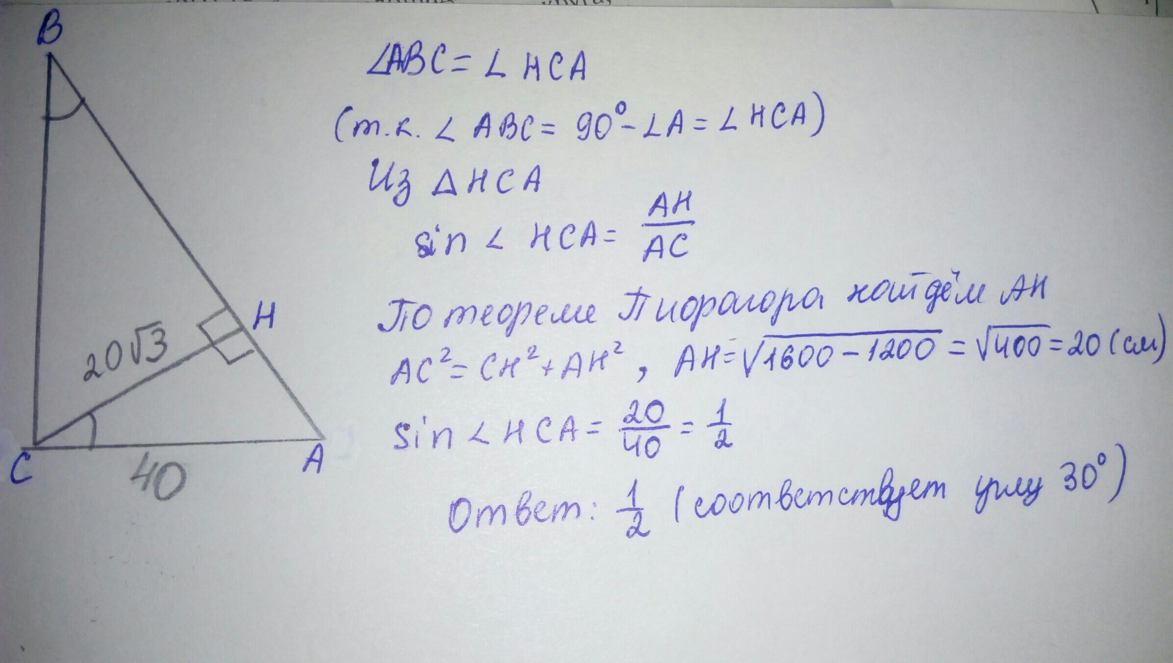 В прямом прямоугольном треугольнике ABC катет AC равен 40 а высота CH опущенная на гипотенузу равна 20 корней из 3 Найдите синус угла ABC. Срочнооооо!!!!