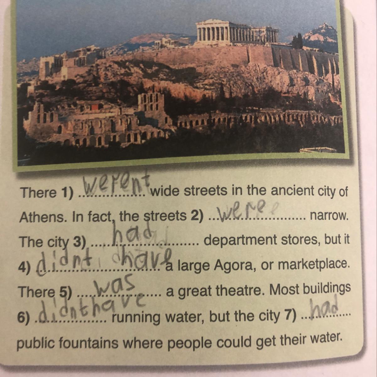 1) не было широких улиц в древнем городе Афины. На самом деле улицы 2) были узкими. В городе 3) были универмаги, но в нем 4)не было большой Агоры или рынка. 5) был Большой театр. В большинстве зданий 6) не было проточной воды, но в городе 7) были общественные фонтаны, где люди могли получить свою воду.