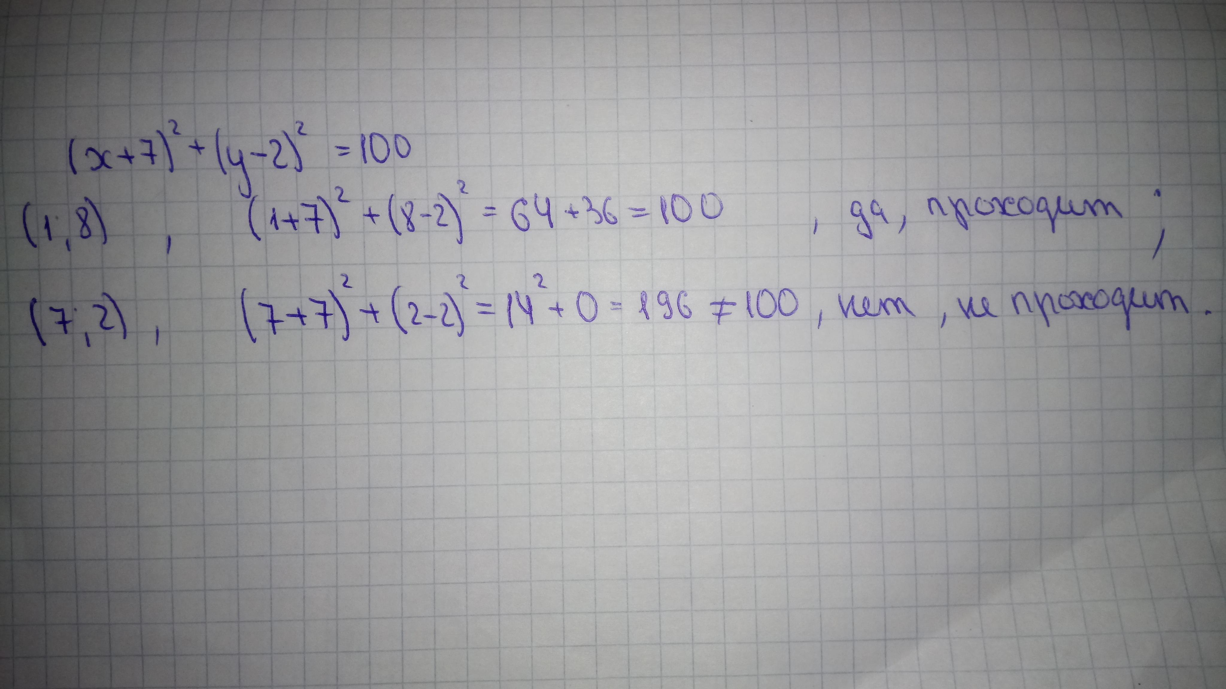Проходит ли окружность заданная уравнением (x+7)^2+(y-2)^2=100 через точки (1;8) и (7;2)