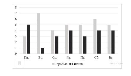 Максим повесил кормушку для птиц. На диаграмме показано, сколько воробьёв и синиц прилетало к кормушке каждый день в течение недели. Сколько птиц прилетало в субботу? решение и ответ