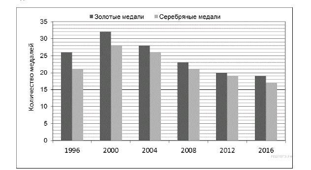 На диаграмме показано, сколько золотых и серебряных медалей завоевали российские спортсмены на Олимпийских играх в разные годы.В каком году разность между количеством золотых и серебряных медалей была наибольшей?
