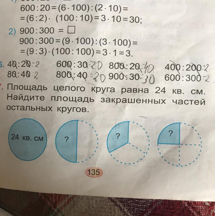 Площадь Целого круга равна 24кв см Найдите площадь закрашенных частей остальных кругов