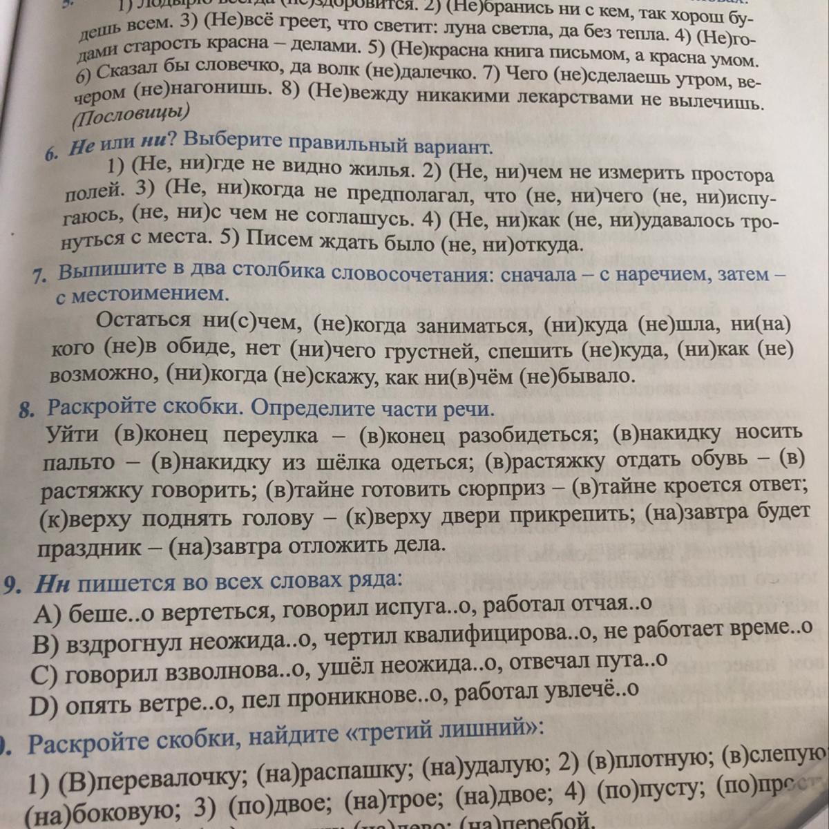С наречием: некогда заниматься, никуда не шла, спешить некуда, никак невозможно, никогда не скажу...С местоимением: остаться ни с чем, ни на кого не в обиде, нет ничего грустней, как ни в чём не бывало.