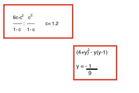 1)\frac{6c-c^2}{1-c} :frac{c^2}{1-c} =frac{c(6-c)*(1-c)}{(1-c)*c^2} =frac{6-c}{c} \\c=1.2\\frac{6-1.2}{1.2}=frac{4.8}{1.2}=4\\Otvet:4\\2)\(4+y)^2-y(y-1)=16+8y+y^2-y^2+y=9y+16\\y=-frac{1}{9}\ \9*(-frac{1}{9})+16=-1+16=15\\Otvet: 15