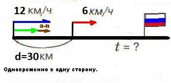 2) T = d/Vc = 30 км : 6 км/ч = 5 ч - время встречи - ответ.