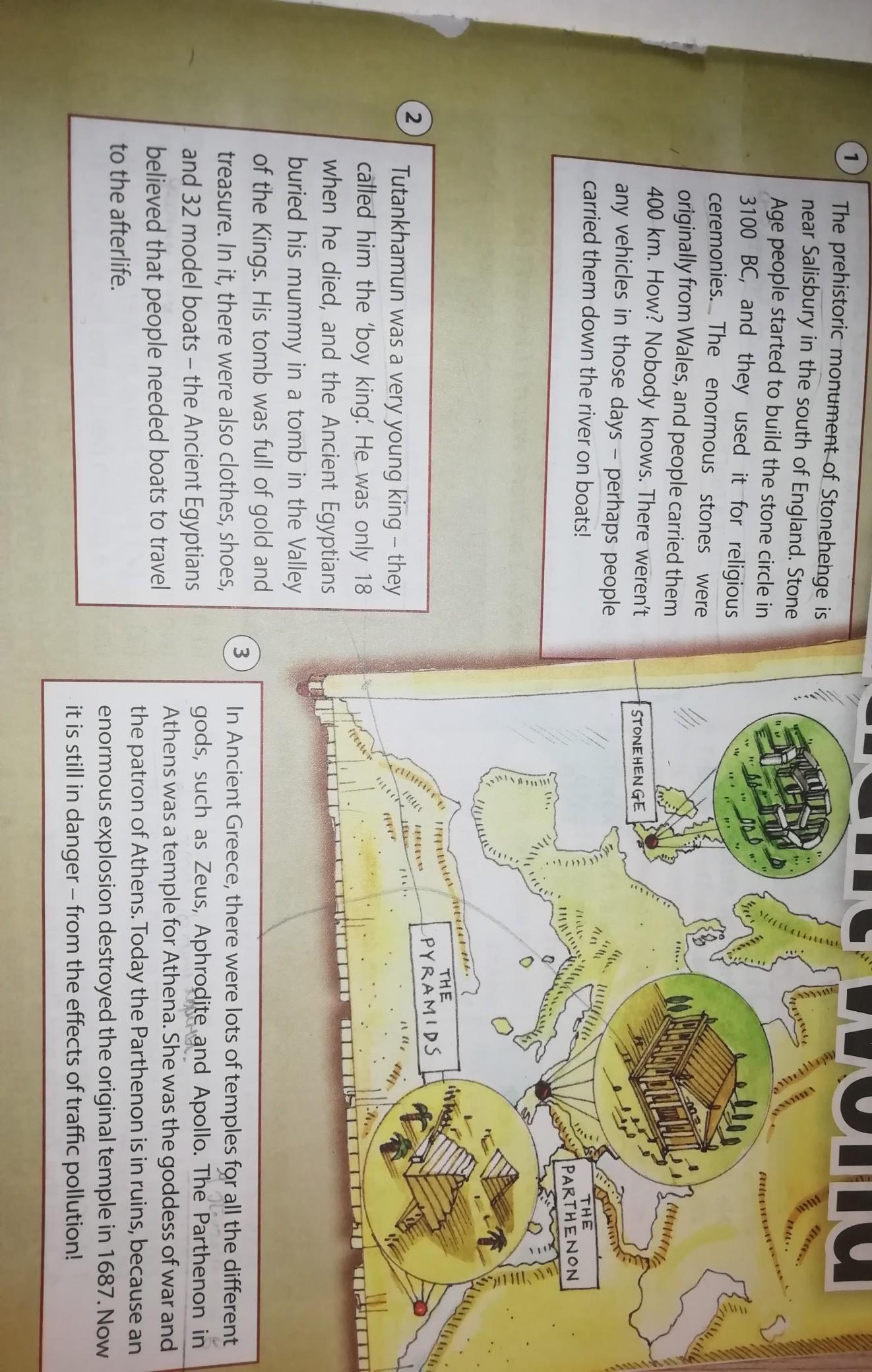 1 Доисторический памятник Стоунхендж находится около города Солзбери на юге Англии. Люди Каменного века начали строить круг из камней в 3100 г. д.н.э. и использовали его для религиозных церемоний. Огромные камни происходят из Уэльса, и люди перенесли их за 400 км. Как? Никто не знает. Тогда не было никаких транспортных средств - возможно, люди доставили их по реке на лодках!