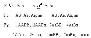 Итак, расщепление признаков у гибридов первого поколения в данном случае было близко к соотношению 9:3:3:1, то есть к тому отношению, которое получается при скрещивании дигетерозигот между собой (АаВв х АаВв, где А – черная окраска шерсти, а – белая; В – вихрастая шерсть, в – гладкая). Проверим это