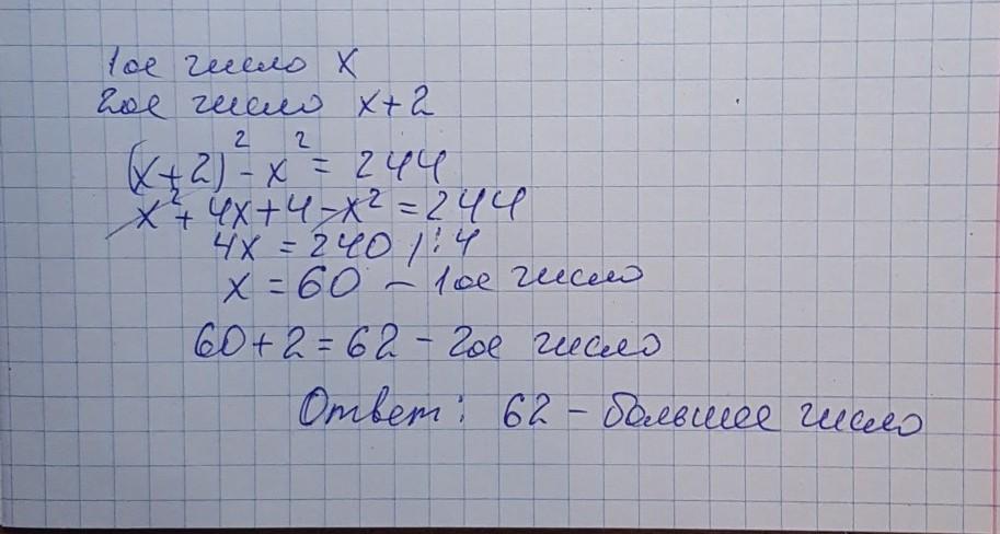 разность квадратов двух последовательных четных натуральных чисел равна 244.Найдите большее число.