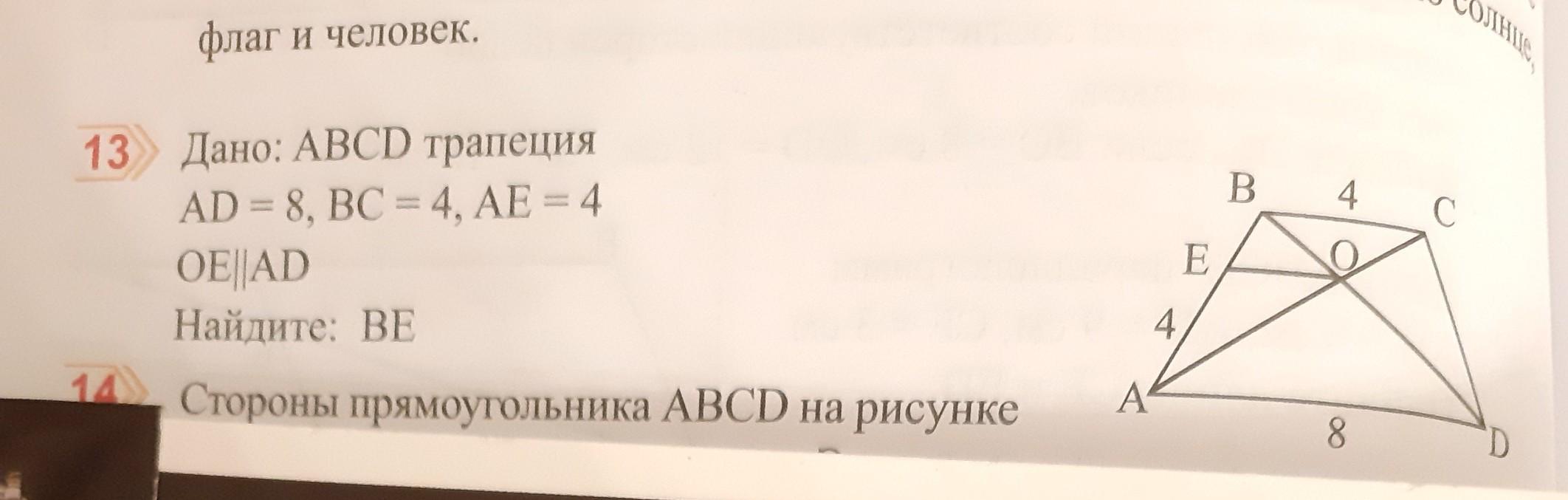 Дано: ABCD трапеция AD=8 , BC=4 , AE=4 OE||AD Найдите : BE