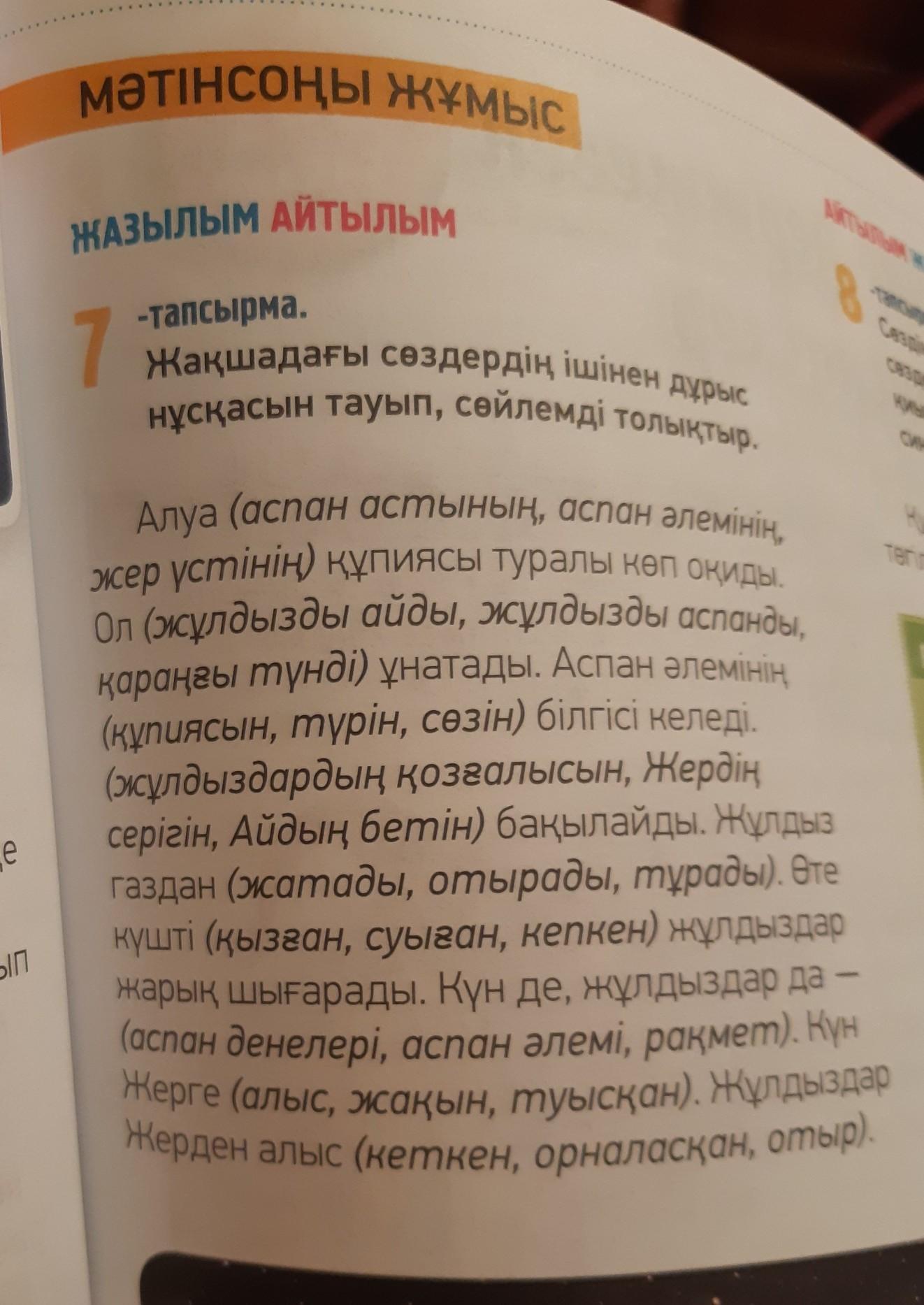 Алуан аспан əлемінің құпиясы туралы көп оқиды. Ол жұлдызды аспанды ұнатады. Аспан əлемінің құпиясын білгісі келеді. Жұлдыздардың қозғалысын бақылайды. Жұлдыз газдан тұрады. Өте күшті қызған жұлдыздар жарық шығарады. Күн де, жұлдыздар да- аспан денелері. Күн Жерге жақын. Жұлдыздар Жерден алыс орналасқан.