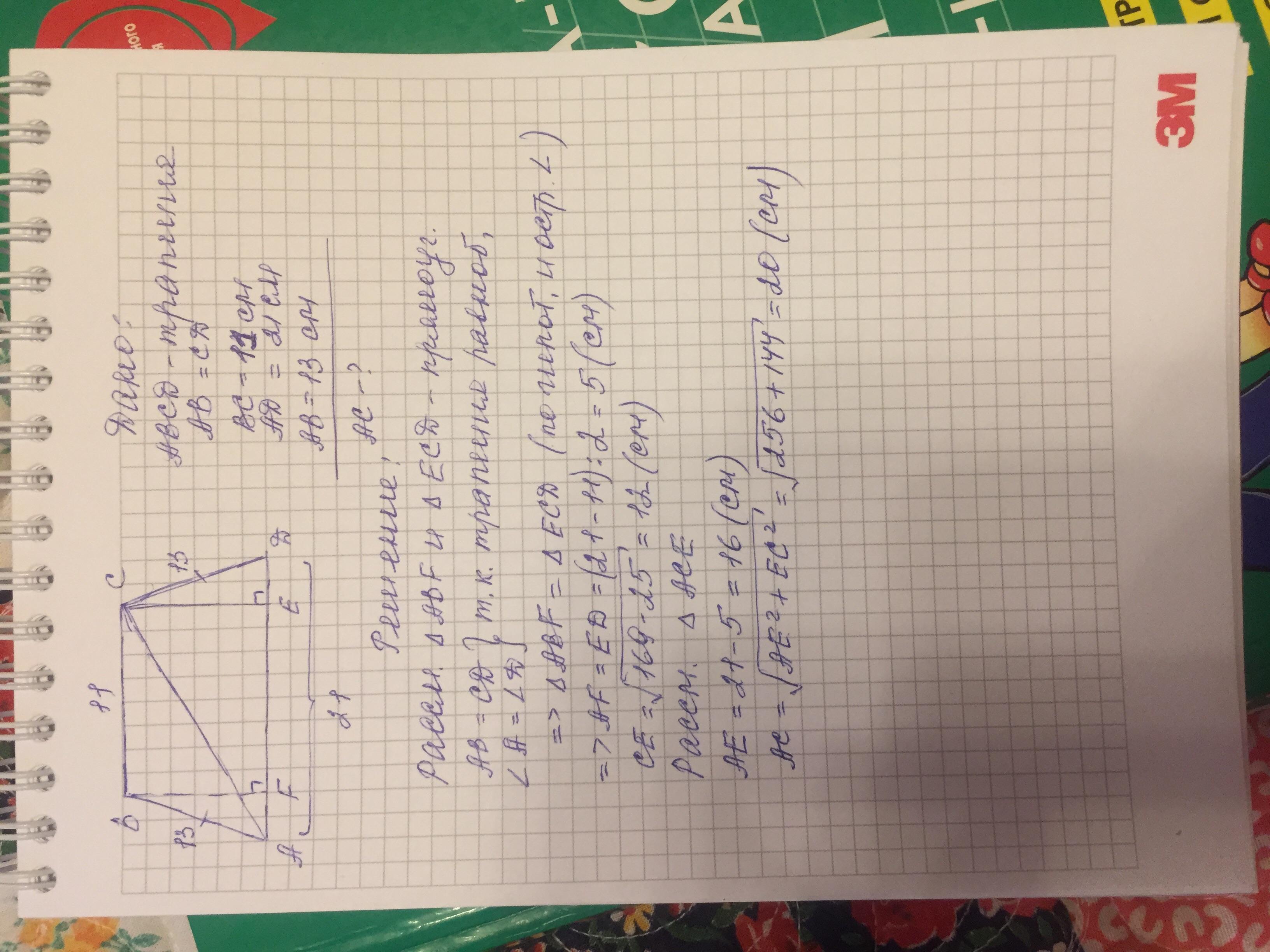 Основания равнобокой трапеции равны 21 см и 11 см, а боковая сторона - 13 см. Найдите диагональ трапеции.