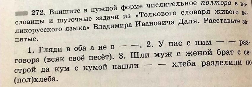 3. Шли муж с женой, брат с сестрой да кум с кумой; нашли полтора хлеба, разделили по полухлебу.