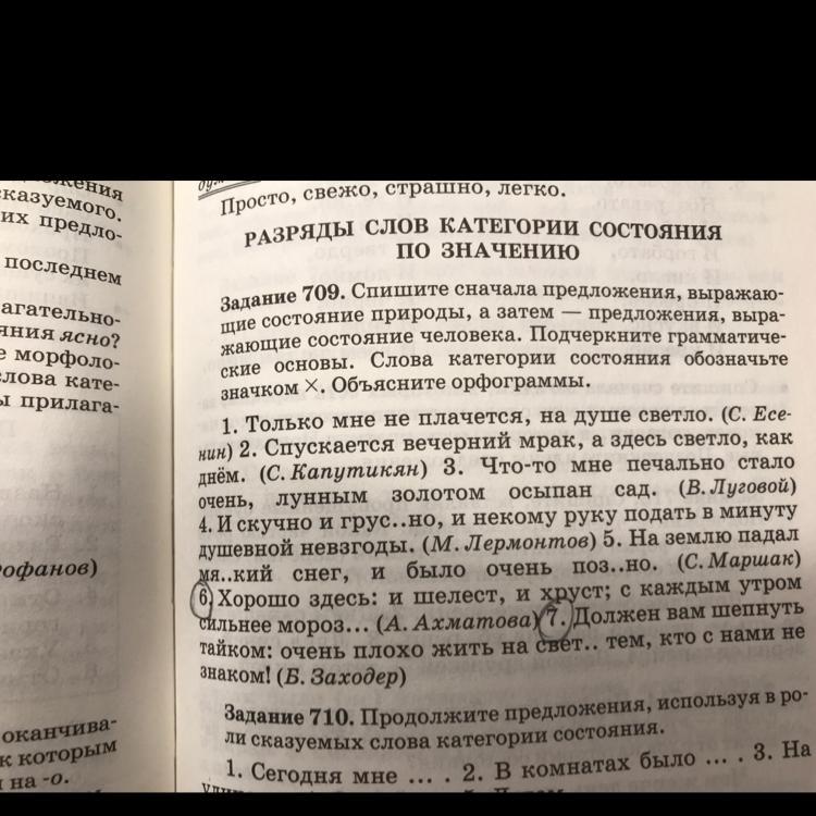 6. Хорошо здесь: и шелест, и хруст; с каждым утром сильнее морозит (сказуемое, выраженное категорией состояния). 7. Должен вам шепнуть тайком: очень плохо (сказуемое, выраженное наречием и категорией состояния) жить на свете тем, кто с нами не знаком!