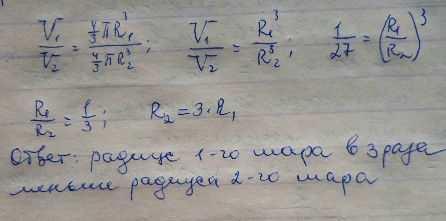 відношення об'ємів двох куль дорівнює 1 : 27. у скільки разів першої кулі менший від радіуса другої кулі»