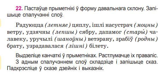 Радуюцца летняму(яму) цяплу, ишли насустрач моцнаму(аму) ветру, удзячны лепшаму(аму) сябру, дапамог старому(ому) чалавеку, уручыли шаноу́наму(аму) ветэрану, зрабиу́ роднаму(аму) брату, узрадавалася лишняму(яму) билету. Прыляцеу́шыя з поу́дня птушки радуюцца летняму цяплу. Птушки-дзейник, радуюцца-выказник.