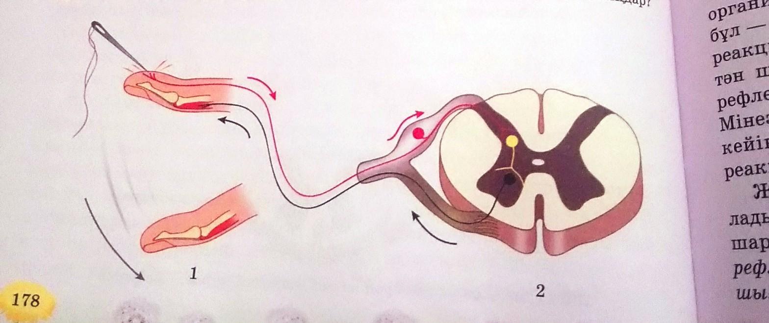 (1 - рефлекс (отдергивание пальца), 2 - спинной мозг)