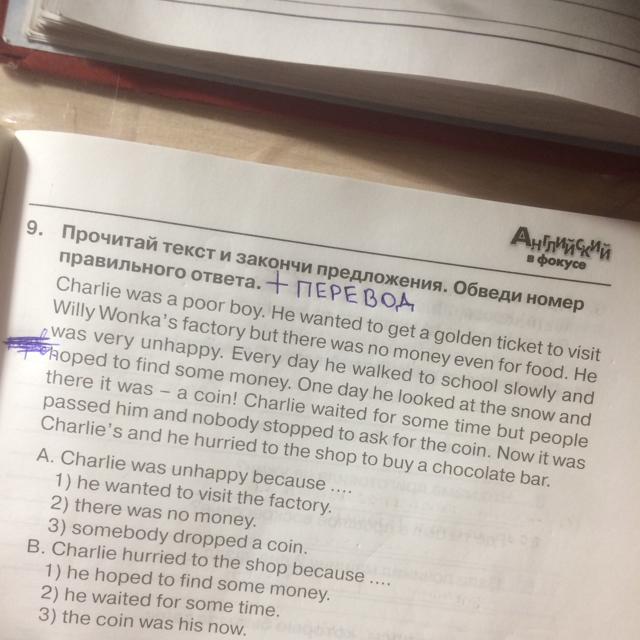 Чарли был бедный мальчик. Он хотел получить золотой билет чтобы посетить Willi Wonka-ину, но у него не было денег ,даже на еду.Он был очень несчастливый. Каждый день он шёл в школу медленно и надеялся найти хоть какие-то деньги. В один день он посмотрел в снег - и там была монетка!Чарли ждал некоторое время , но люди проходили мимо него и никто не спрашивал о монетке. Теперь это было Чарлино и он поспешил в магазин чтобы купить шоколадку