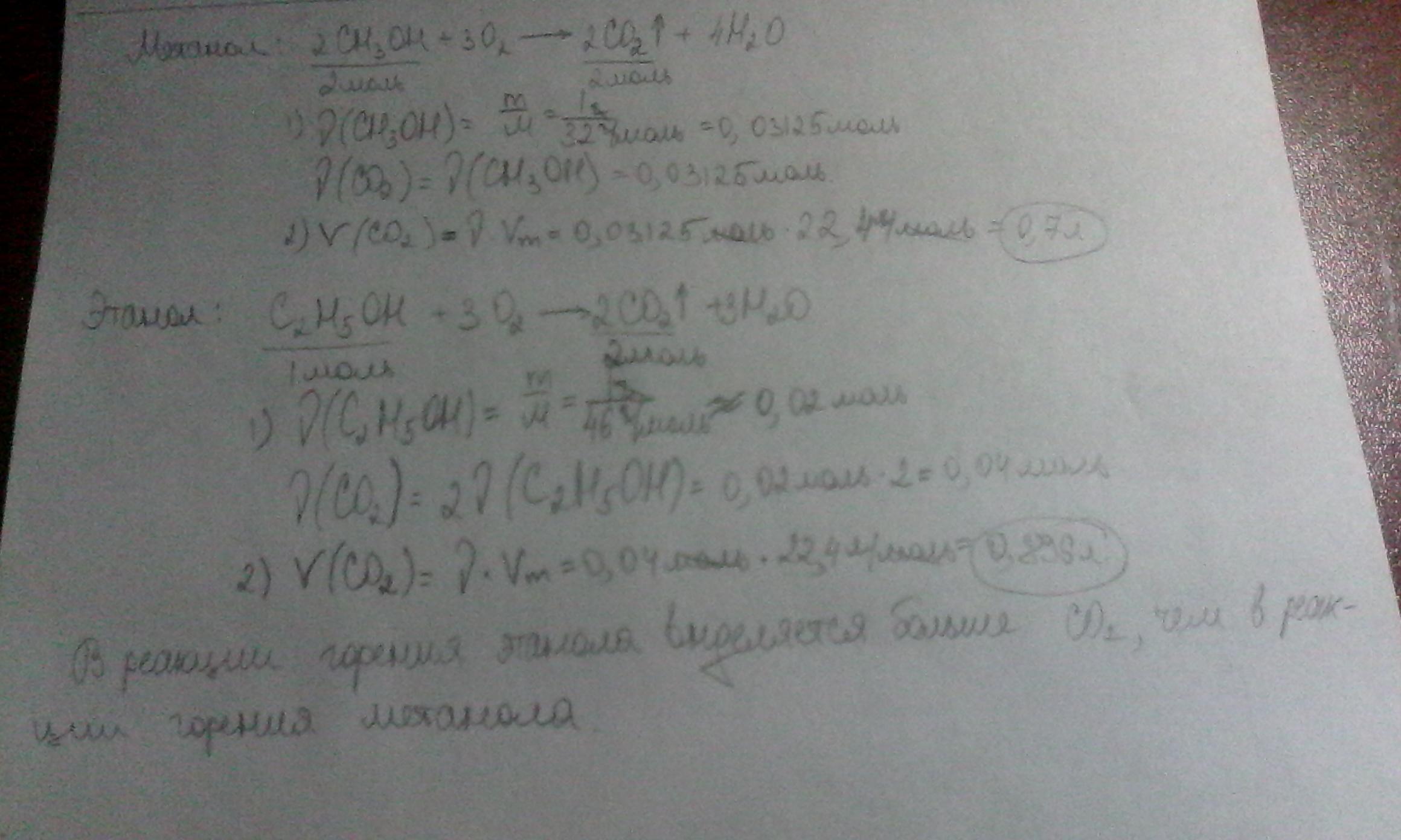 сравните объем углекислого газа (н.у.), который выделяется при сгорании 1 г метанола и 1 г этанола