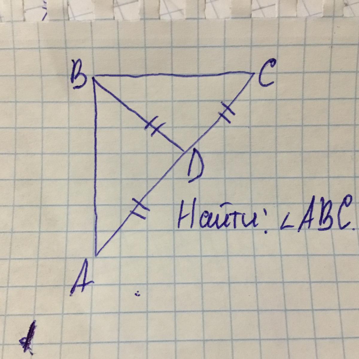 Т.к. AD=BD=DC => тр.ABD и тр.CBD - равнобедренные с основаниями BA и BC соответственно. А из того, что в равнобедренных тр. углы при основании равны =>, что угол ABD = углу CBD, а BD - высота обоих тр. => угол ABD и угол CBD = 45 градусов, а угол ABC = углу ABD + угол CBD = 90 градусов.