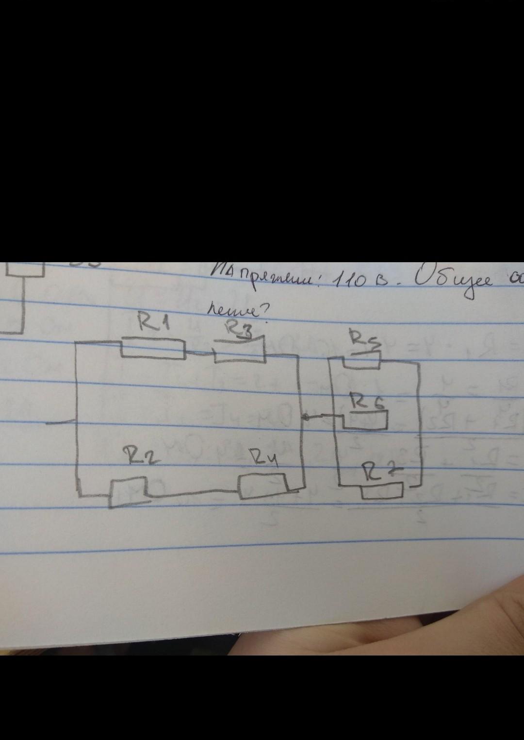 определить общее сопротивление цепи и силу пока в ней, если R1=10 Ом, R2=20 Ом, R3=50 Ом,R4=20 Ом, R5=48 Ом, R6=16 Ом,R7=12 Ом. Напряжение :110В.Найти общее сопротивление?