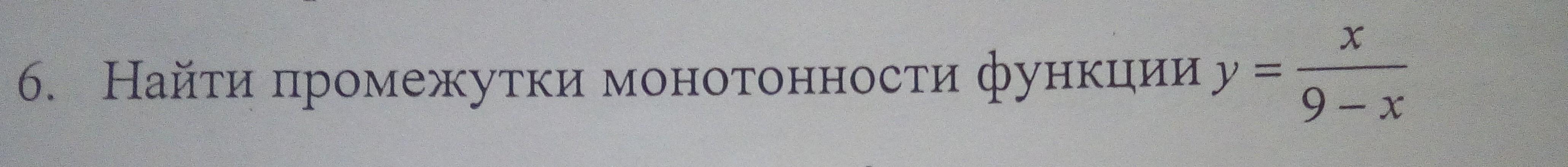 y`=1*(9-x)-x*(-1) /(9-x)^2=9-x+x /(9-x)^2=9/(9-x)^2, производная положительна на всей области определения, критических точек нет, значит функция возрастает (-~:9) и (9; +~)
