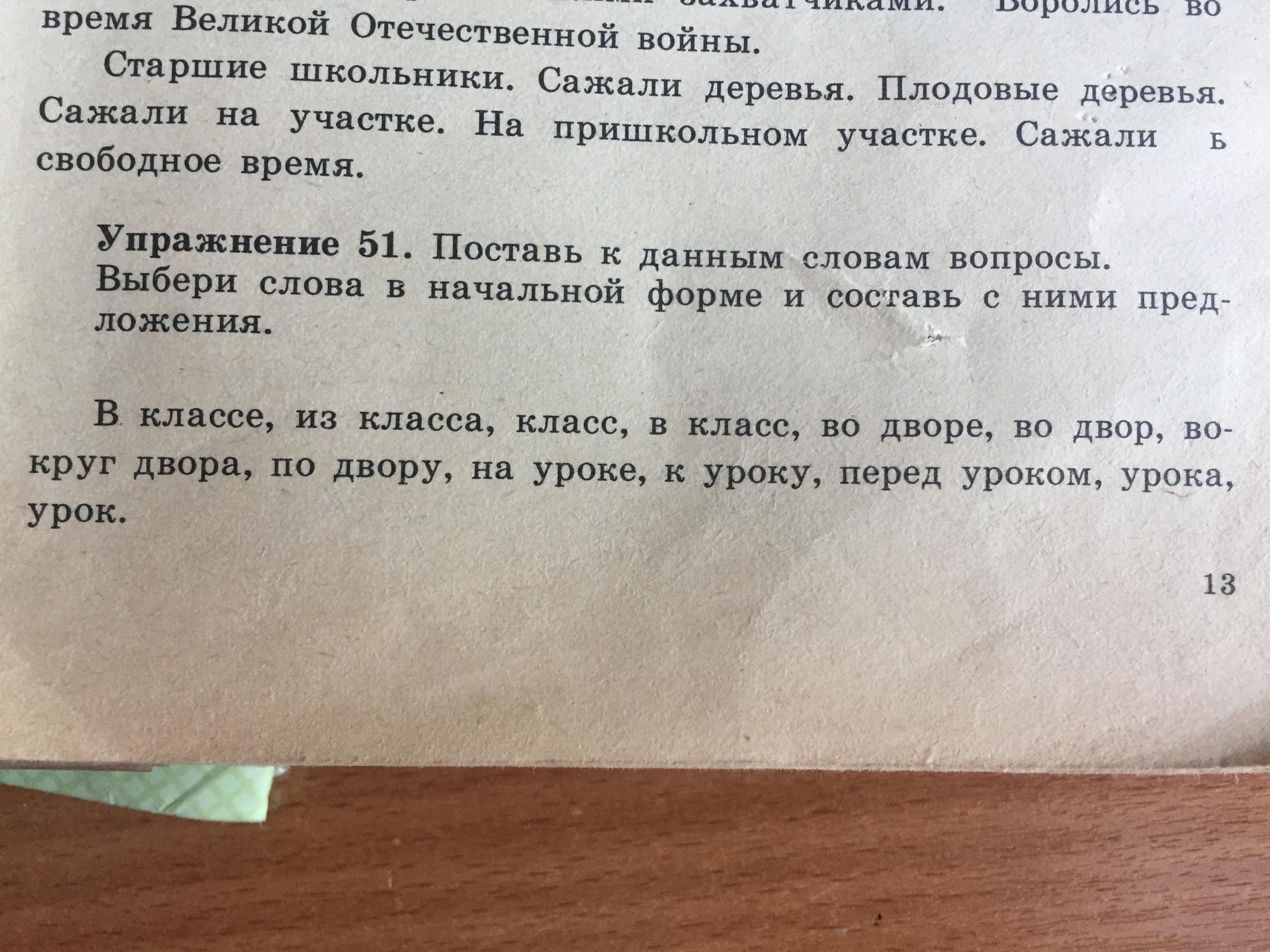 В (чём?) классе, из (чего?) класса, (что?) класс, в (что?) класс, во (чём?) дворе, вокруг (чего?) двора, по (чему?) двору, на (чём?) уроке, к (чему?) уроку, перед (чем?) уроком, (чего?) урока, (что?) урок.