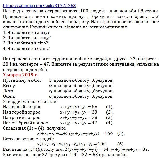 Посеред океану на острові живуть 100 людей – правдолюби і брехуни. Правдолюби завжди кажуть правду, а брехуни – завжди брешуть. У кожного з них є одна улюблена пора року. На острові провели соціологічне опитування. Кожний житель відповів на чотири запитання:
