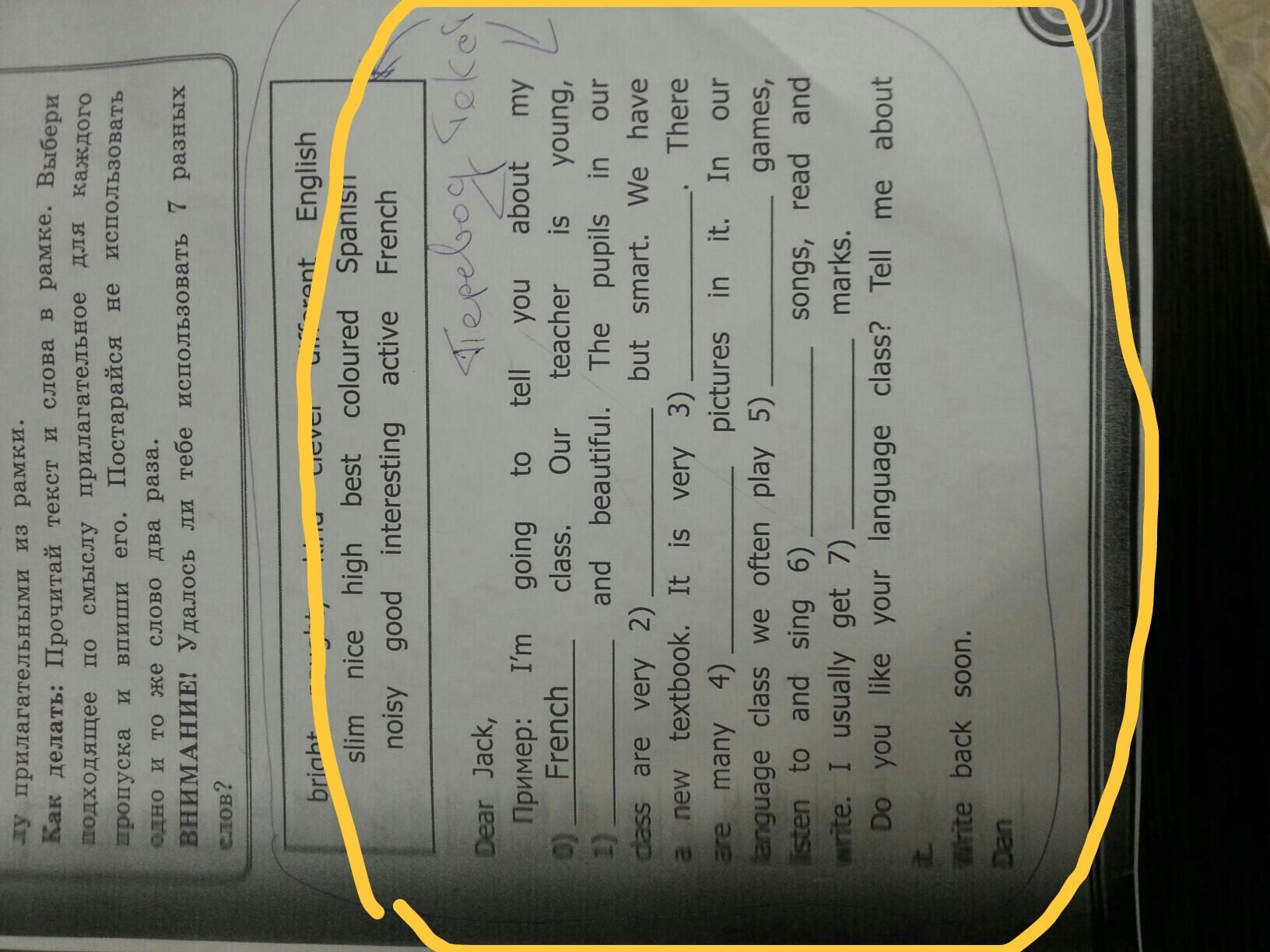Я хочу рассказать вам о моем классе французского. Наша учительница молодая,... и красивая. Ученики в нашем классе очень..., но умные. У нас есть новая книжка с тестами (тестовик ). Он очень..... В ней много... картинок. В нашем классе мы часто играем в.... игры, слушаем и поем... песни, читаем и пишем. Обычно я получаю.... оценки. А тебе нравится твой языковой класс? Расскажи мне о нём. Ответь мне позже. Дэн