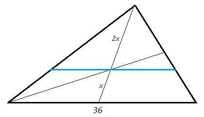 Параллельная прямая отсекает подобный треугольник. Отрезок медианы исходного треугольника является в нем соответствующим элементом (построенным одинаковым образом). Отношение соответствующих элементов подобных треугольников равно коэффициенту подобия. Медианы треугольника точкой пересечения делятся в отношении 2:1 от вершины. Таким образом, коэффициент подобия отсеченного и исходного треугольников равен 2/3. Искомая сторона равна 36*2/3 =24