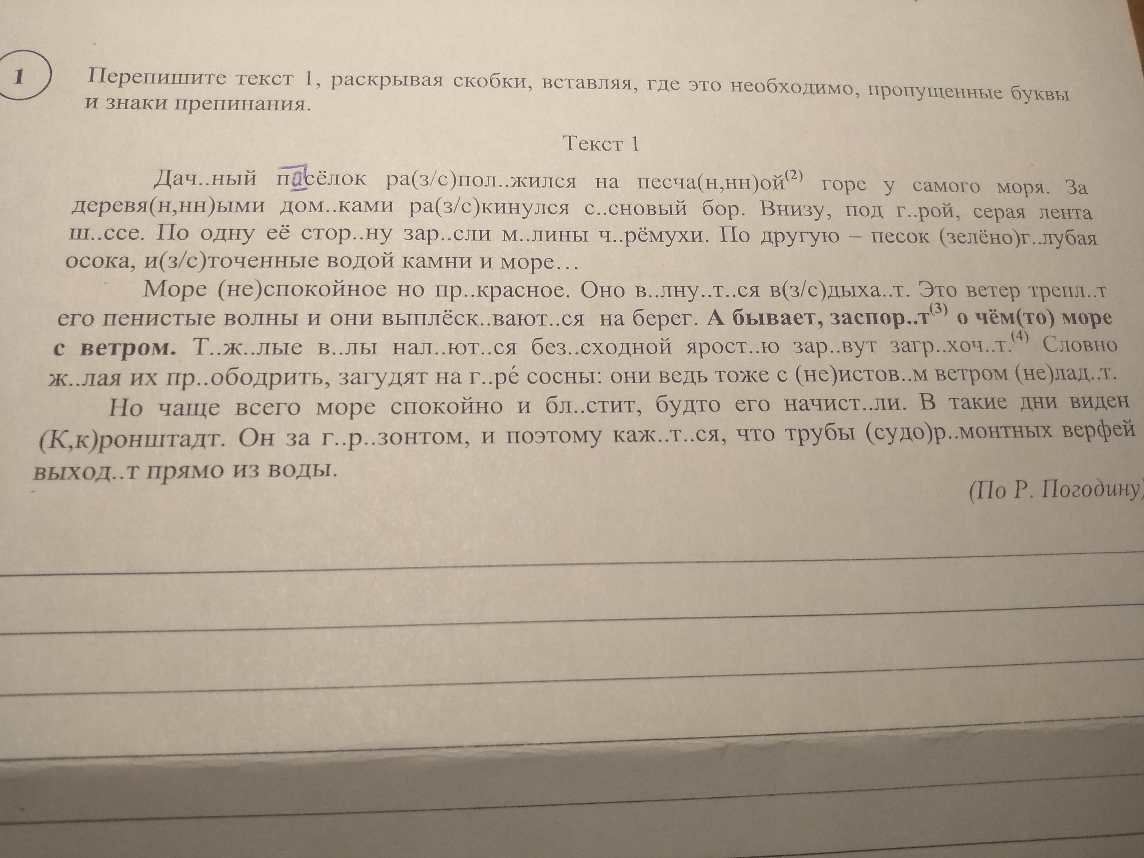 Дачный поселок расположился на песчанной горе,у самого моря.За деревянными домиками раскинулся сосновый бор.Внизу ,под горой,серая лента шоссе.По одну ее сторону заросли малины,черемухи.По другую-песок,зелено-голубая осока,источенные водой камни и море... Море неспокойное,но прекрасное.Оно волнуется,вздыхает.Это ветер треплет его пенистые волны и они выплескиваются на берег.А бывает ,заспорят о чем-то море с ветром.Тяжелые валы нальются безысходной яростью ,заревут,загрохочут.Словно желая их приободрить,загудят на горе сосны:они ведь тоже с неистовым ветром не ладят.Но чаще всего море спокойно и блестит,будто его начистили.В такие дни виден Кронштадт.Он за горизонтом, и поэтому кажется ,что трубы судоремонтных верфей выходят прямо из воды.