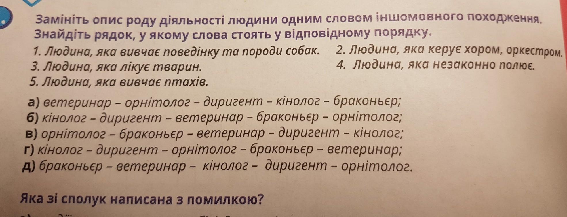 Б) кінолог,диригент,ветеренар,браконьер,орнітолог