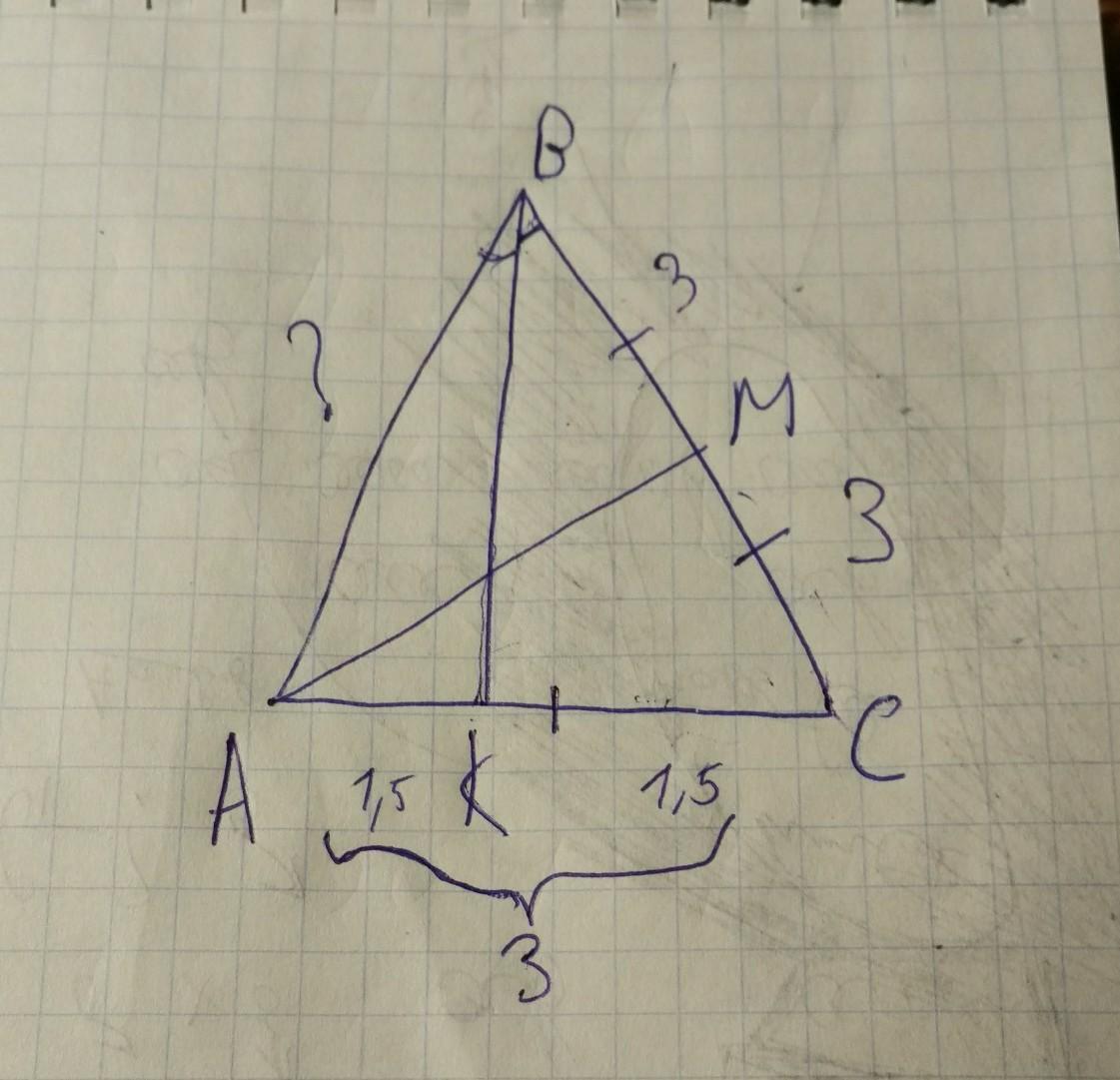 ДАМ 30 БАЛЛОВ!!!!!!!!!! В треугольнике abc проведена биссектриса bk и медиана am. ak=kc=1,5 см. а треугольник amc является равнобедренным с основанием am. найдите ab.
