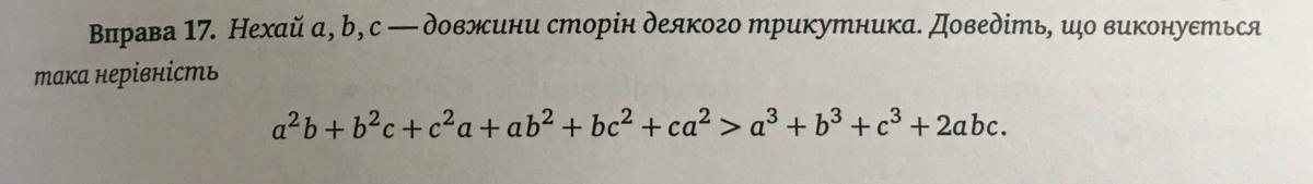 a²b+b²c+c²a+ab²+bc²+ca²>a³+b³+c³+2abc. Трюк, который я собираюсь использовать, придуман не мной, но он очень эффективен в подобного типа задачах. Он сводится к тому, что мы используем замены a=x+y; b=x+z; c=y+z. То, что такие положительные x, y, z существуют (и, кстати, определены однозначно) следует из возможности вписать в треугольник окружность. Стороны точками касания при этом оказываются разбиты на отрезки, которые разбиваются на три пары равных отрезков - это следует из равенства отрезков касательных. Преимущество такой замены следует из того, что в отличие от сторон треугольника, которые связаны неравенством треугольника, отрезки x, y и z могут быть любыми. После указанной замены и приведения подобных членов (конечно, это требует некоторых навыков и аккуратности) получаем неравенство
