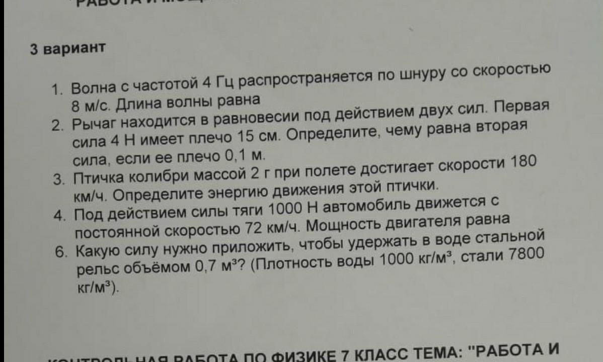 5. Какую силу нужно приложить, чтобы удержать в воде стальной рельс объёмом 0,7 м³? (Плотность воды 1000 кг/м³, стали 7800 кг/м³)