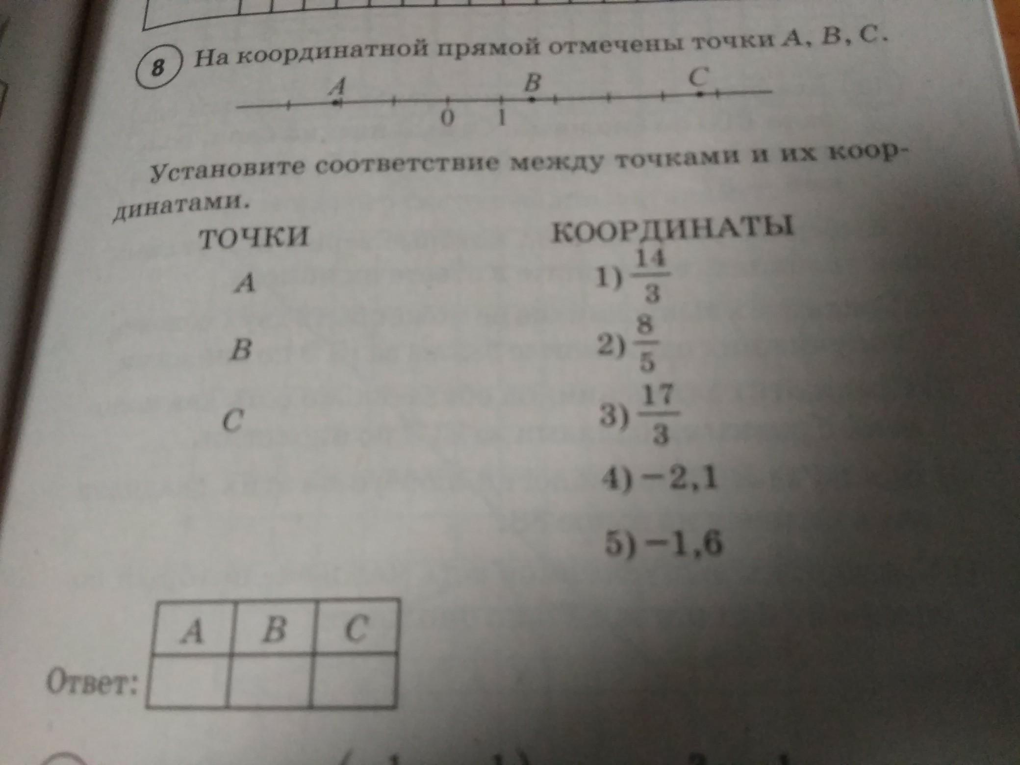 На координатной прямой отмечены точки А,В,С. Установите соответствие между точками и их координатами.