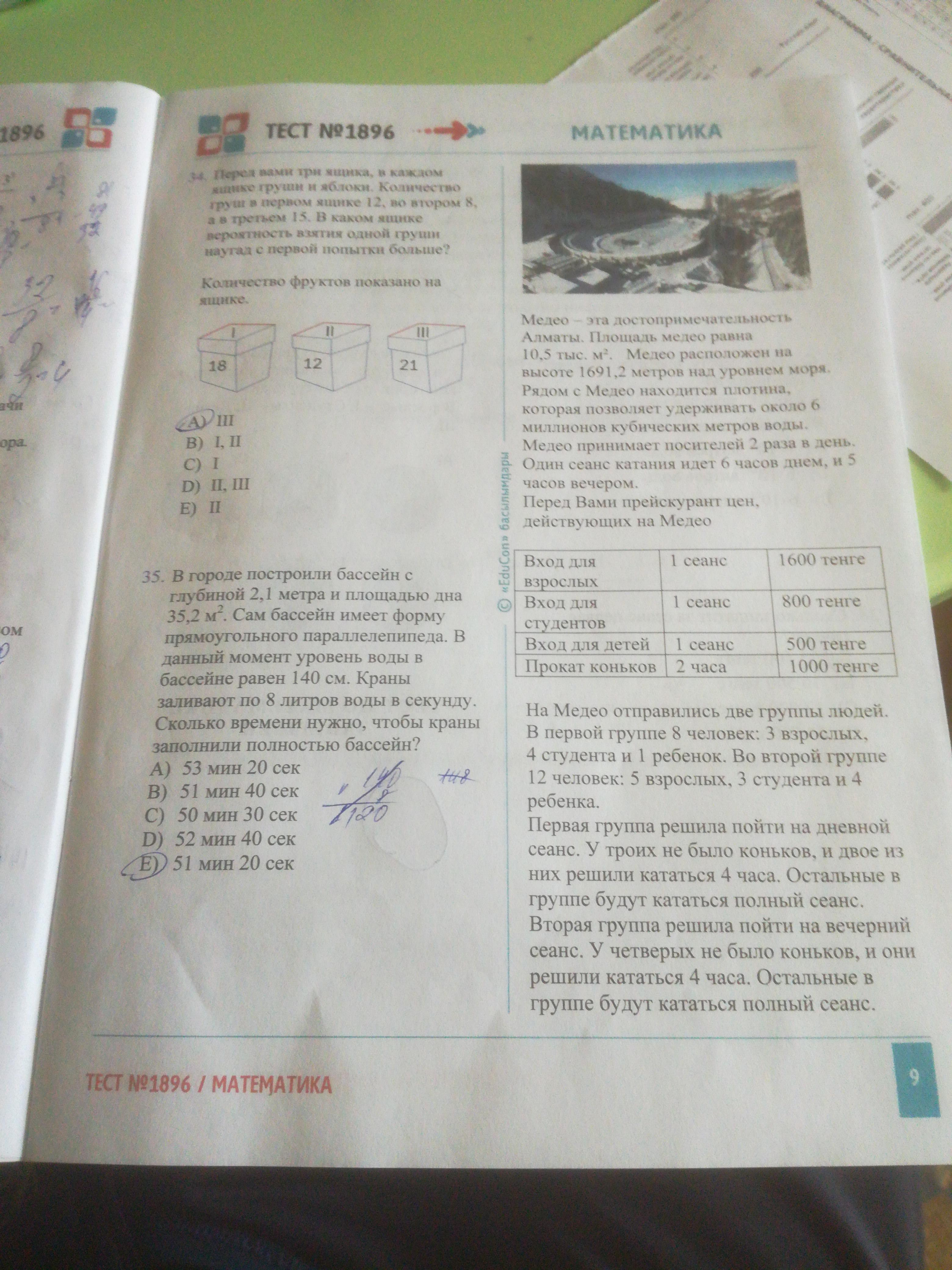 34. Вероятность вынуть грушу из 1го ящика -12/18, 2го- 8/12, 3го- 15/21, сравниваем и получаем наибольшую вероятность 0.71 из 3го -ответ