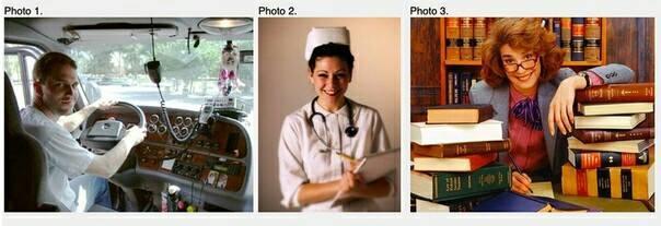 In the first picture we see the driver who drives the minibus. He is 25-29 years old. He has a steering wheel and a lot of buttons. He is very happy that he is driving a minibus. In the second picture, we see a nurse, who hangs up the patient. She is wearing a white robe, a white cap and an listening device. She is also very happy to work here. In the third picture we see the reader. She has a lot of books. She has red hair and has glasses. She is also very happy to read.