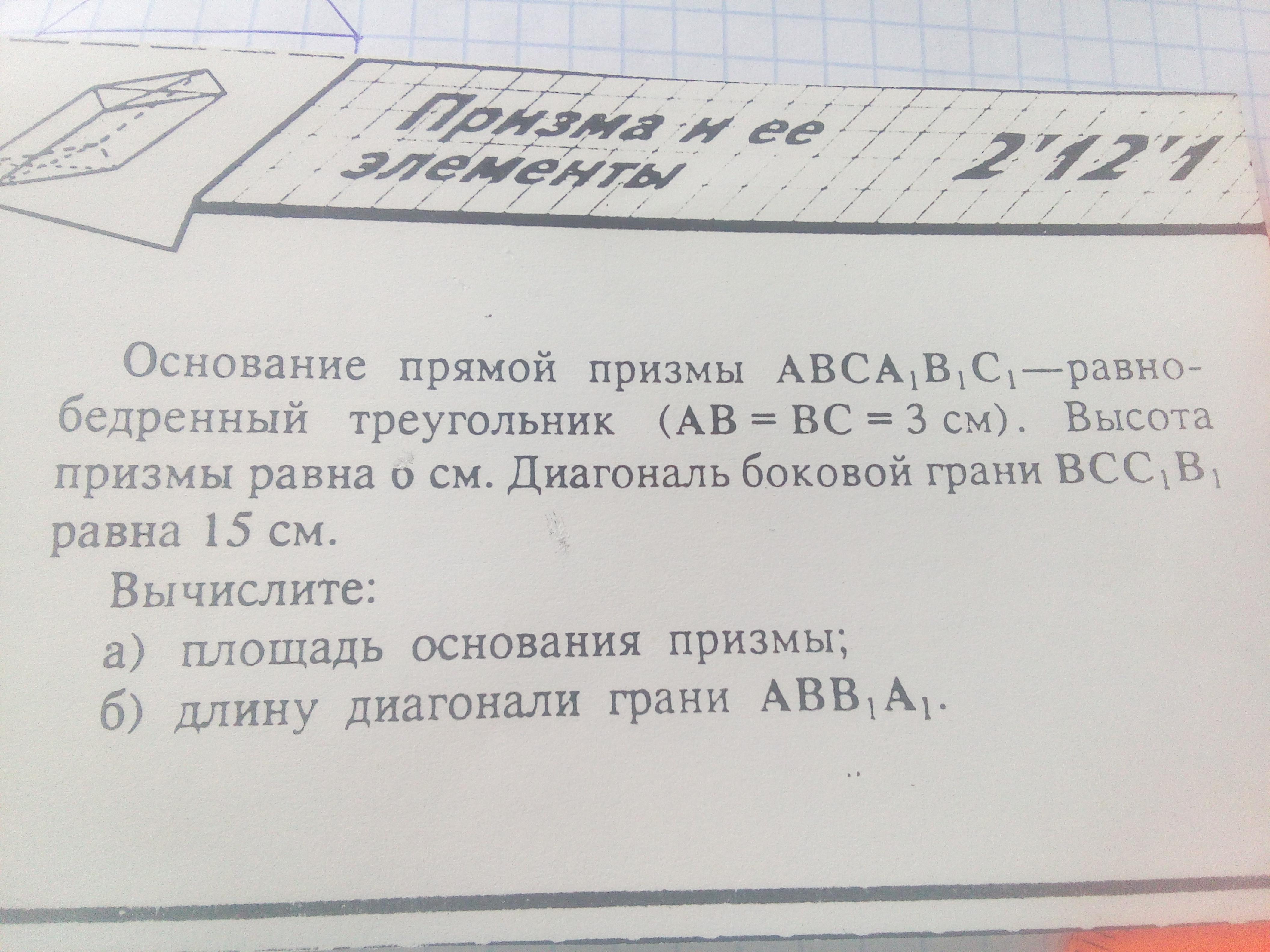 Основание прямой призмы ABCA1B1C1 равнобедренный треугольник (AB=BC=3 см) высота призмы 6 см.Диагональ боковой грани BCC1B1=15 см