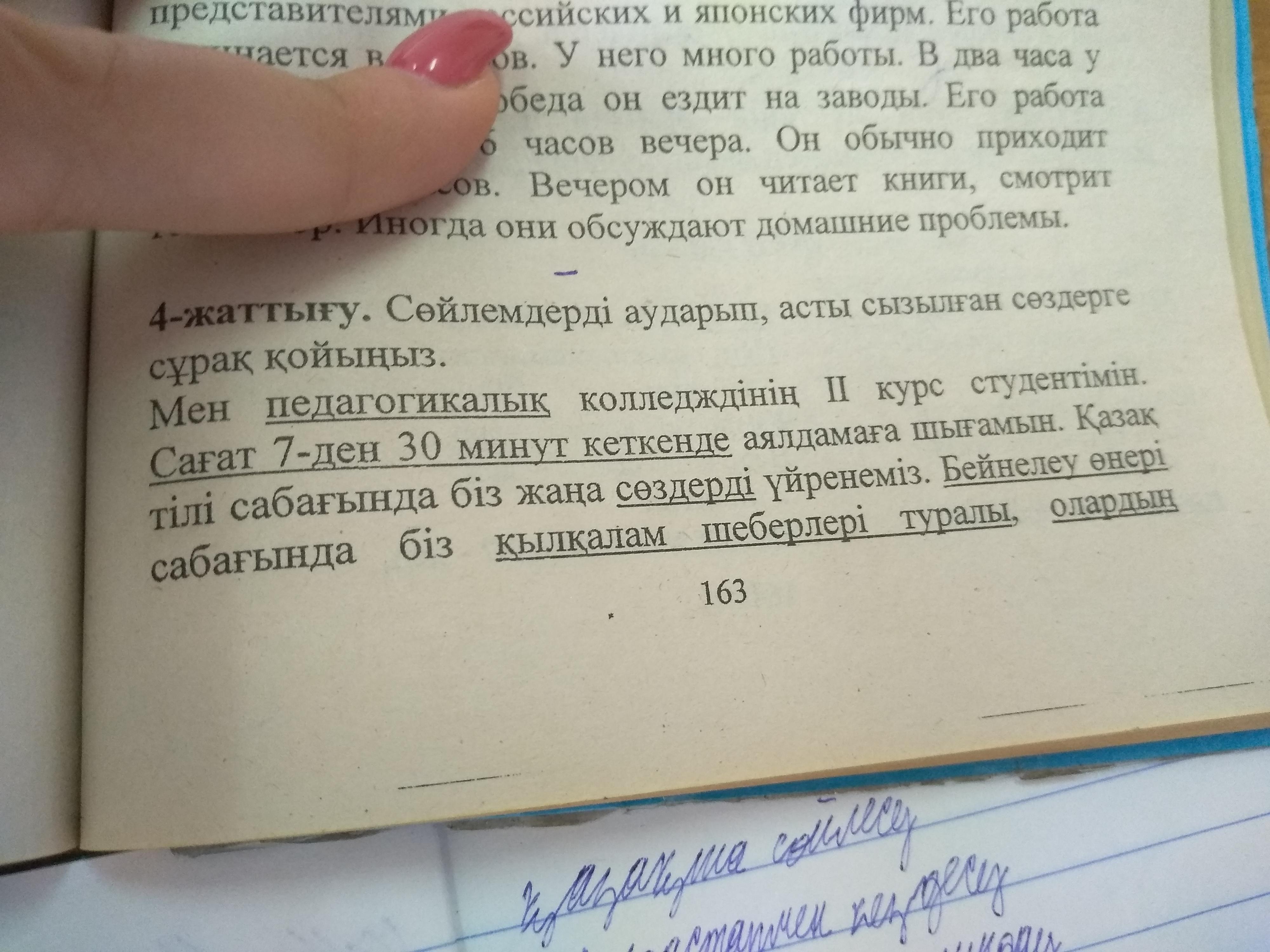 Я студент 2 курса педагогического колледжа.в 7:30 выхожу на останлвку.на уроке казахского учим новые слова.на изо вроде прлходим про каких тл учителей .К вечеру я помогаю родителям.