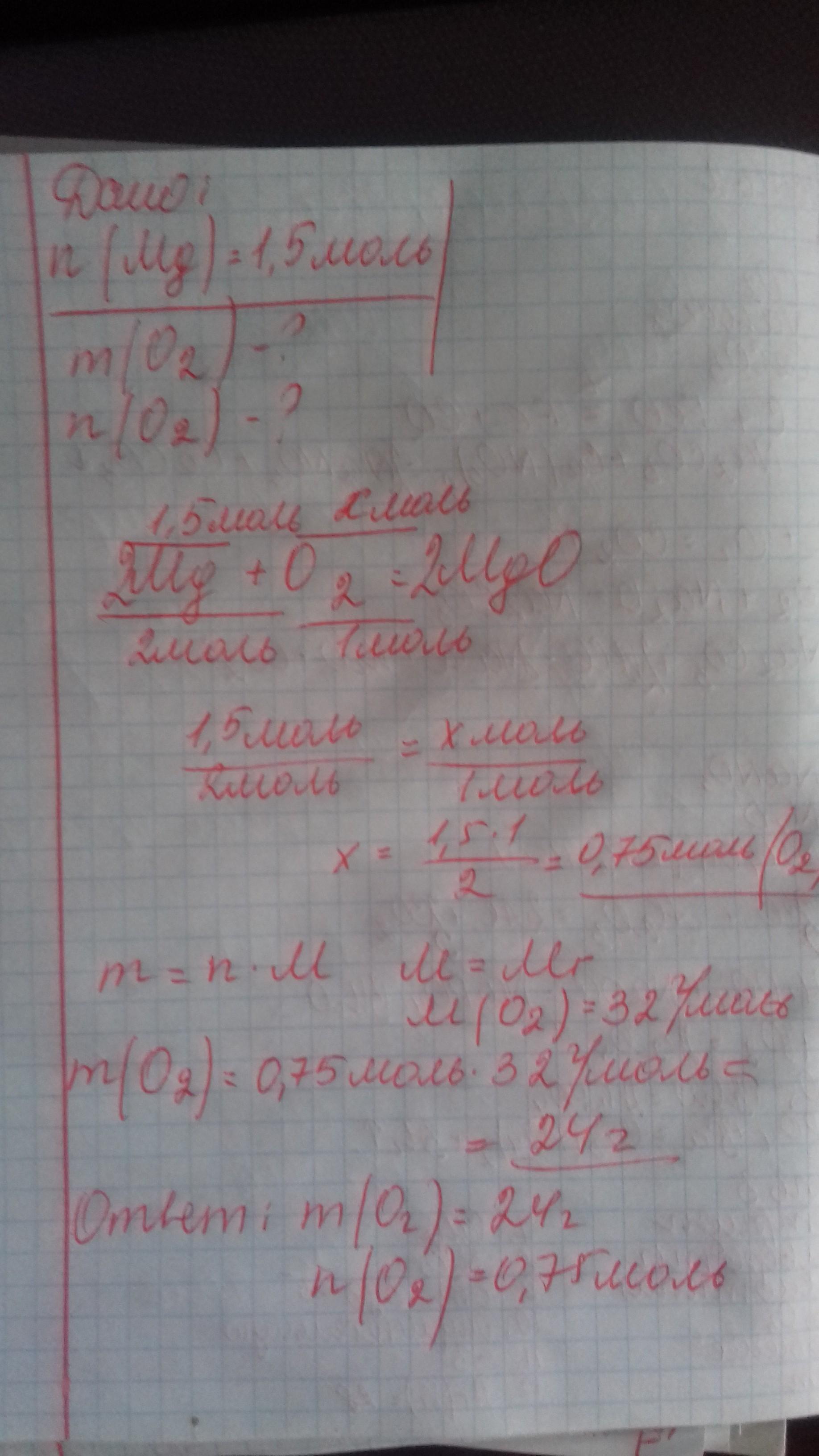 в реакцию вступили 1.5моль магния.Определите массу кислорода и кол-во вещества кислорода ,которое вступило в реакцию